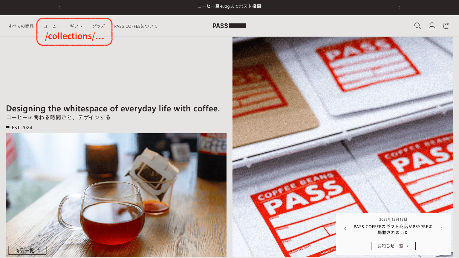 ヘッダーやフッターのリンクはコレクションに統一して、検索やSNSからの入口として機能させています。
